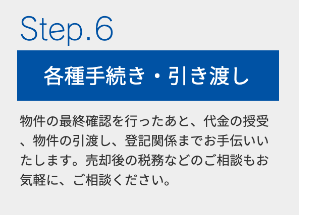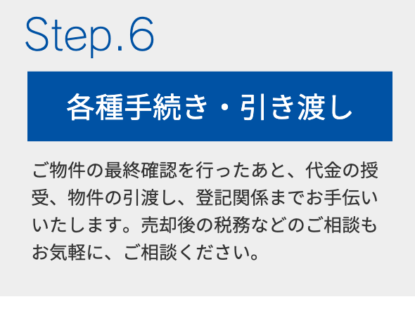 お客様の諸事情などによって、お持ちの不動産の売却を検討された場合、まず何から始めたらいいの?そんな不安を経験豊富なスタッフが適切な売却価格をご提案いたします。最新の不動産市況はもちろん、街の情報なども熟知した経験豊富なスタッフが法律関係や税務についての疑問や不安を解消いたします。